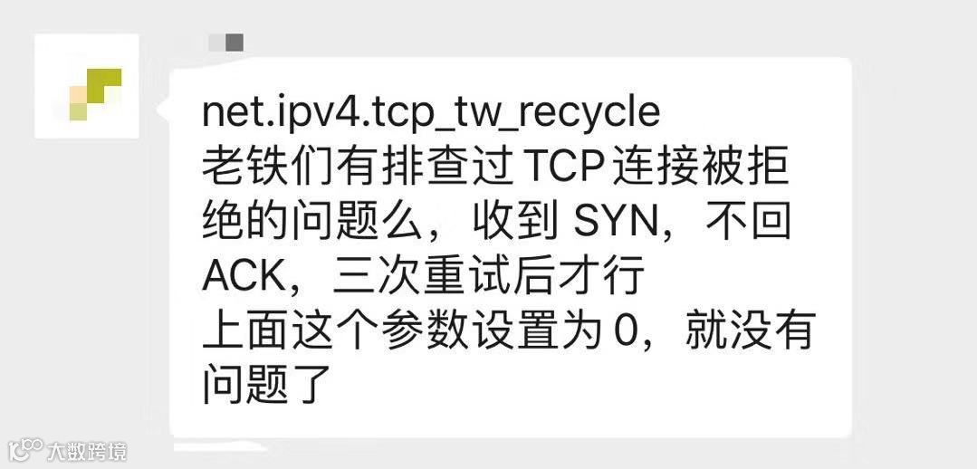 比如你在学校,对外可能就一个公网 IP,然后开启了 tcp_tw_recycle(tcp_timestamps 也是打开的情况下),在 60 秒内对于同源 IP 的连接请求中 timestamp 必须是递增的,不然认为其是过期的数据包就会丢弃。