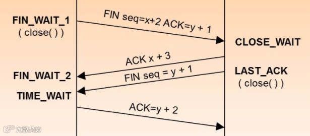 从图中可以看到主动关闭方的状态是 FIN_WAIT_1 到 FIN_WAIT_2 然后再到 TIME_WAIT,而被动关闭方是 CLOSE_WAIT 到 LAST_ACK。