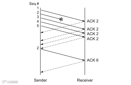 于是又引入了数据驱动的重传叫快速重传,什么意思呢?就是发送方如果连续三次收到对方相同的确认号,那么马上重传数据。