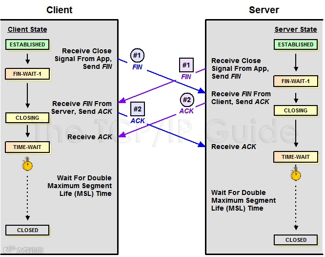 可以看到双方都主动发起断开请求所以各自都是主动发起方,状态会从 FIN_WAIT_1 都进入到 CLOSING 这个过度状态然后再到 TIME_WAIT。