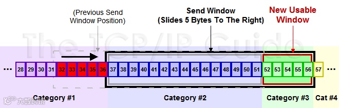 然后此时收到了 36 的 ACK,并且发出了 46-51 的字节,于是窗口向右滑动了。