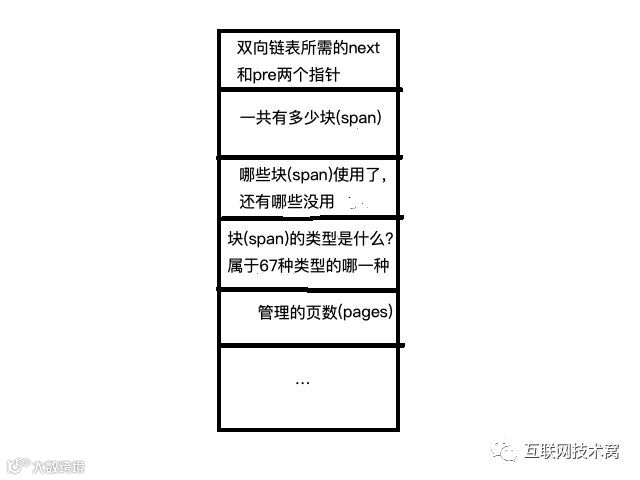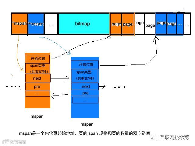 有人会问:mspan结构体存放在哪儿?其实,mspan结构本身的内存是从系统分配的,在此不做过多讨论。mspan在上文讲 spans的时候具体讲过,就是方便根据对象大小来分配使用的内存块,一共有67种类型;最主要解决的是内存碎片问题,减少了内存碎片,提高了内存使用率。mspan是双向链表,其中主要的属性如下图所示: