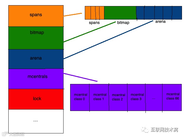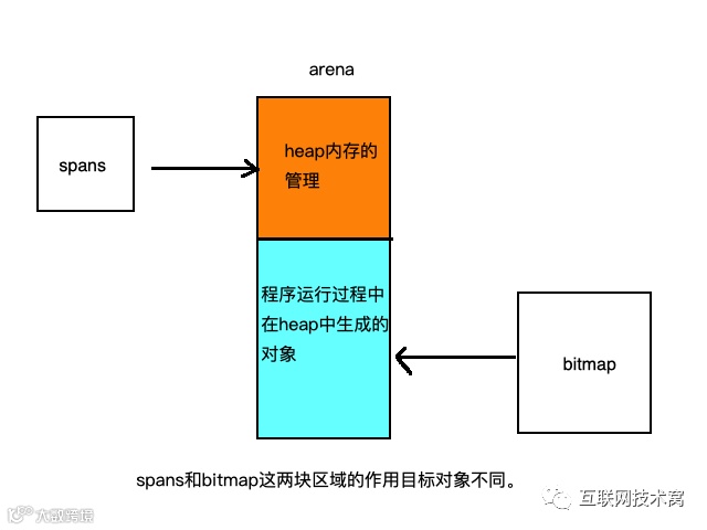 arena中包含基本的管理单元和程序运行时候生成的对象或实体,这两部分分别被 spans和 bitmap这两块非heap区域的内存所对应着。逻辑图如下:
