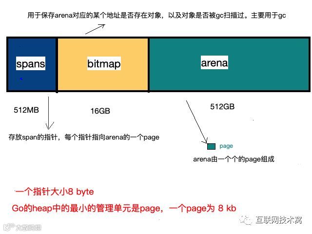 spans区域,可以认为是用于上面所说的管理分配arena(即heap)的区域。此区域存放了 mspan的指针, mspan是啥后面会讲。spans区域用于表示arena区中的某一页(page)属于哪个 mspan。
