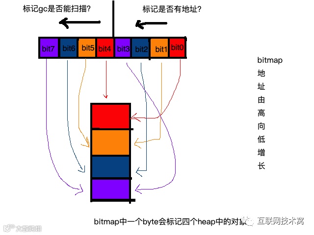 bitmap 有好几种:Stack, data, and bss bitmaps,再就是这次要说的 heap bitmaps。在此bitmap的做作用是标记标记 arena(即heap)中的对象。一是的标记对应地址中是否存在对象,另外是标记此对象是否被gc标记过。一个功能一个bit位,所以, heap bitmaps用两个bit位。bitmap区域中的一个byte对应arena区域的四个指针大小的内存的结构如下: