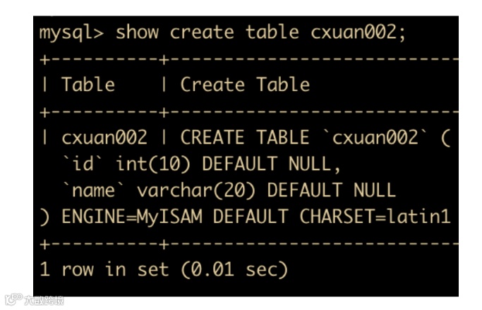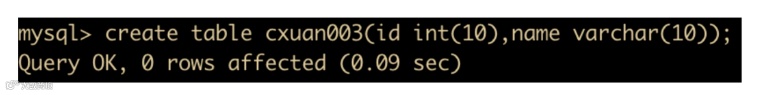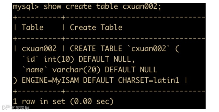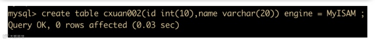 create table cxuan002(id int(10),name varchar(20)) engine = MyISAM;