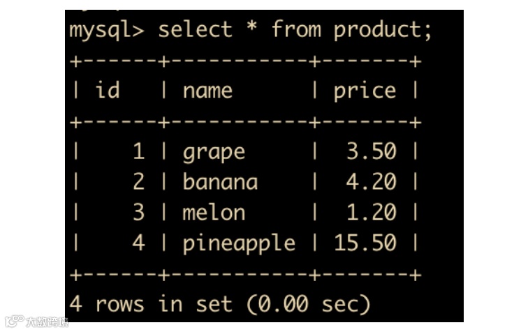 我们进行 select 查询,可以看到现在 product 表中有四条数据