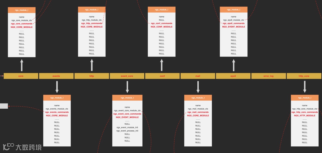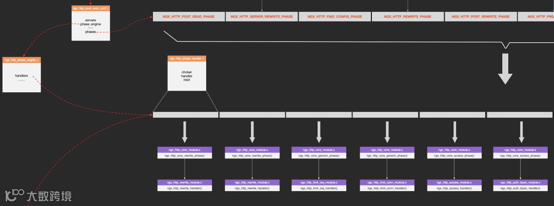 不过在初始化过程中,ngx_http_init_phase_handlers函数将该二维数组转换成了一维数组。下图是nginx中各模块挂载情况: