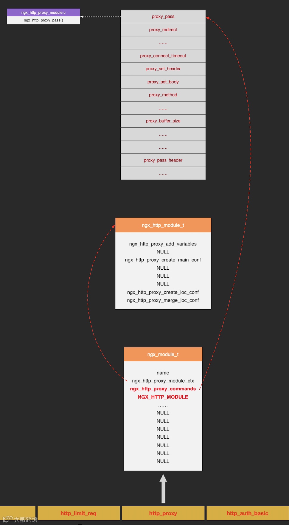 每个模块有一个支持的命令解析列表,在初始化过程中,主进程将会遍历所有模块的命令列表,进行配置文件中的命令解析,如经常用的ngx_http_proxy_module:
