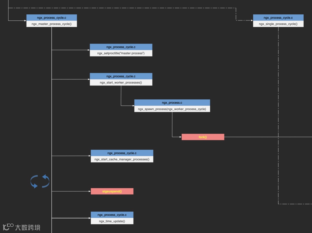 以常见的多进程版本为例,进入该函数后,首先设置进程名称为:"master process",随后启动各工作子进程。