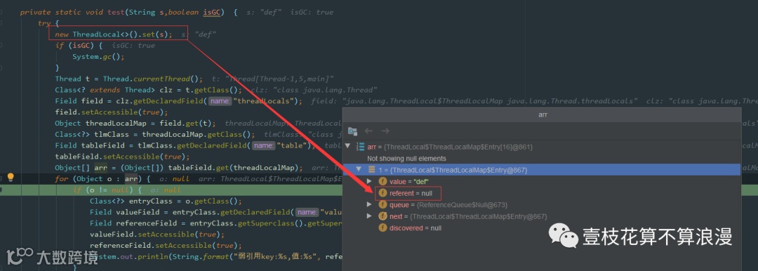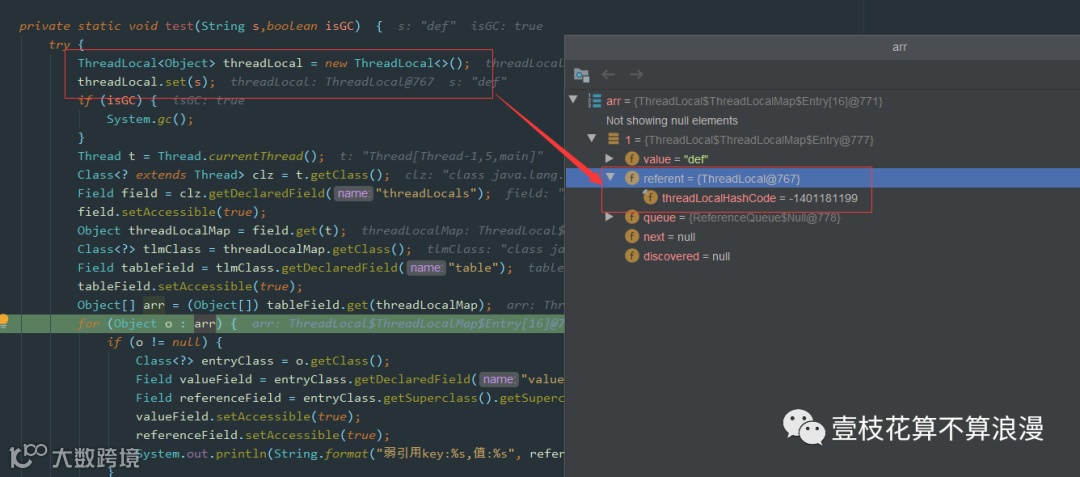 接着再来看下代码,我们使用反射的方式来看看GC后ThreadLocal中的数据情况: