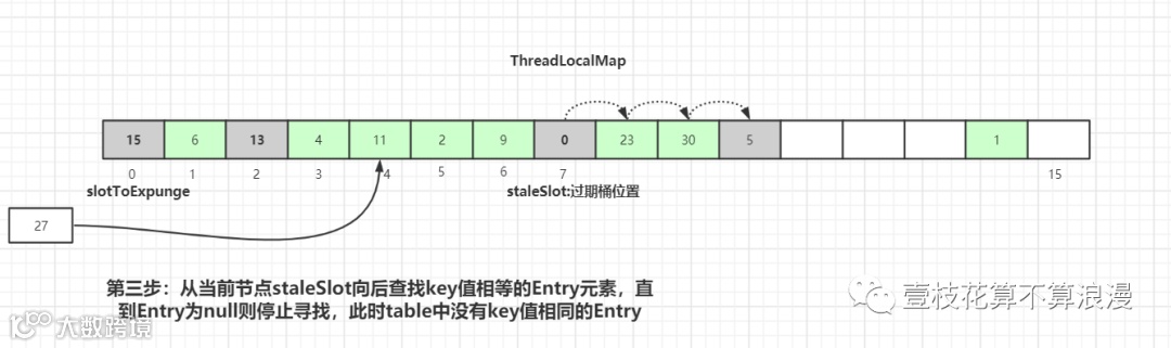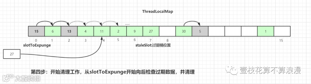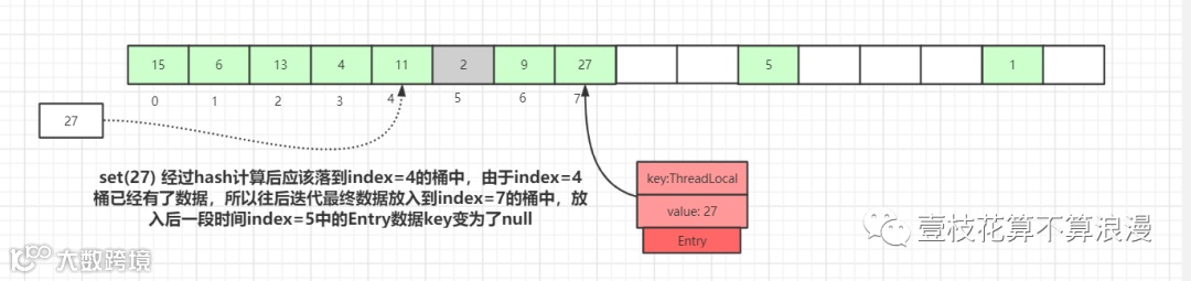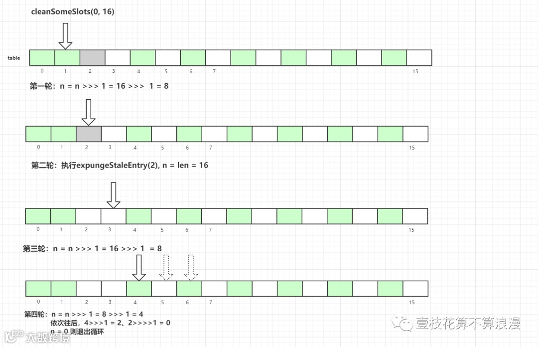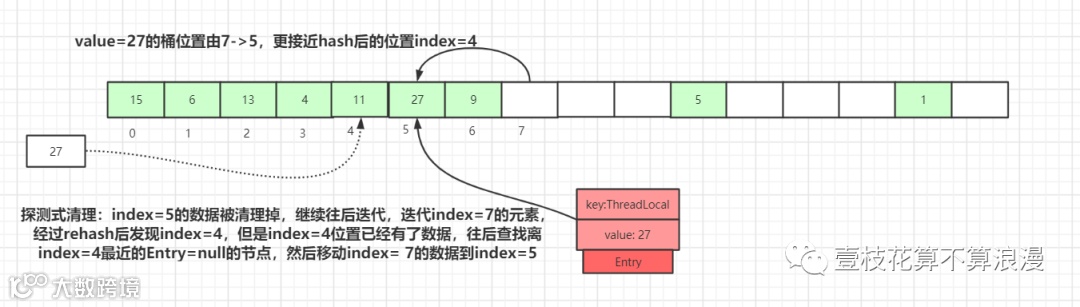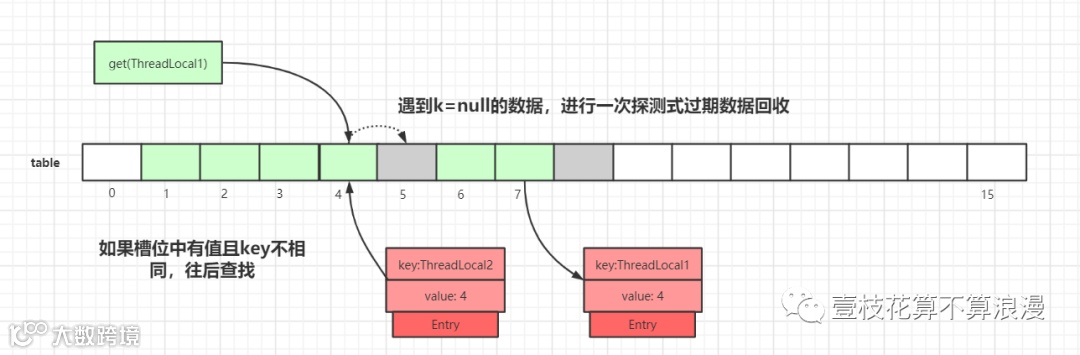 探测式清理是以当前Entry 往后清理,遇到值为null则结束清理,属于线性探测清理。