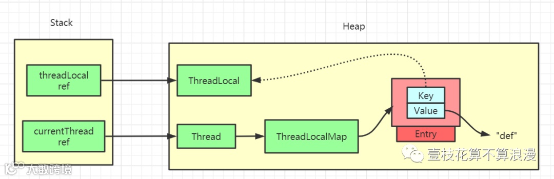 ThreadLocalMap有自己的独立实现,可以简单地将它的key视作ThreadLocal,value为代码中放入的值(实际上key并不是ThreadLocal本身,而是它的一个弱引用)。
