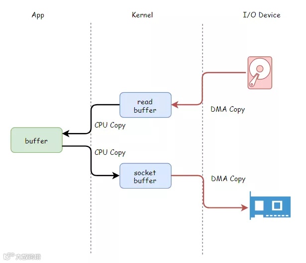 上面的工作线程,从磁盘读文件、再通过网络发送数据,数据从磁盘到网络,兜兜转转需要拷贝四次,其中CPU亲自搬运都需要两次。
