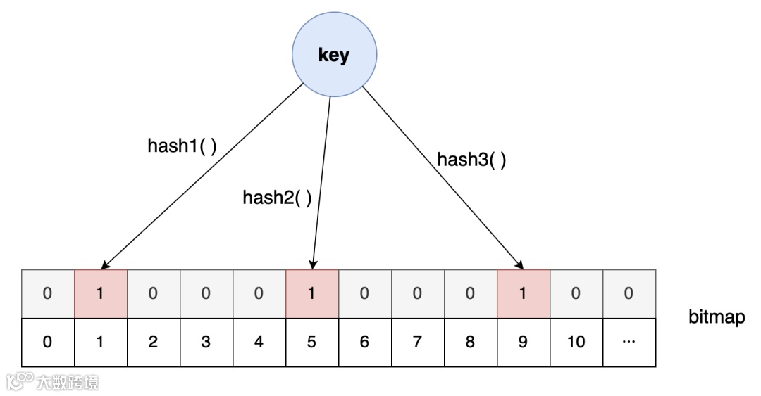 当设置对应的key-value时,按照一组哈希算法的计算,将对应比特位置1。