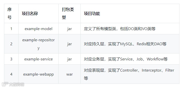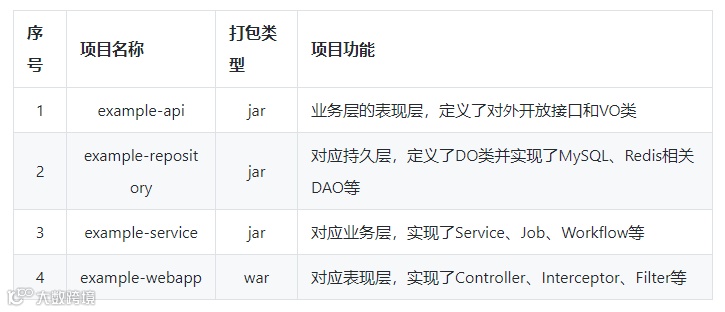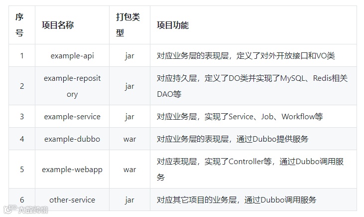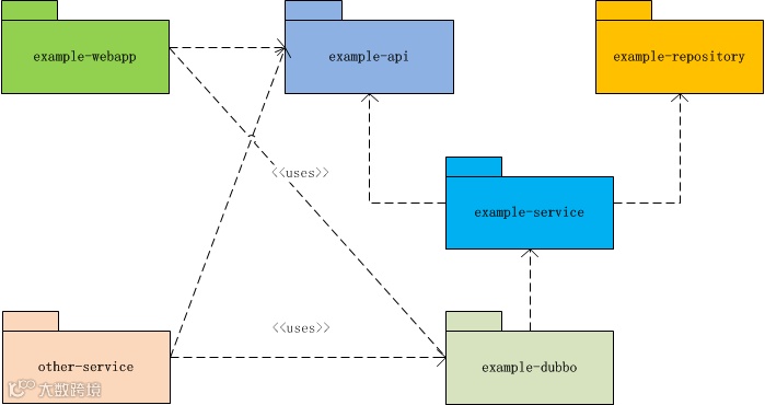 服务化的项目搭,就是把业务层项目(example-service)和持久层项目(example-repository)通过 Dubbo 项目(example-dubbo)打包成一个服务,向业务层项目(example-webapp)或其它业务项目(other-service)提供API项目(example-api)中定义的接口函数。