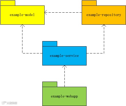 共用模型的项目搭建,把所有模型类放在一个模型项目(example-model)中,其它项目(example-repository、example-service、example-website)都依赖该模型项目,关系图如下: