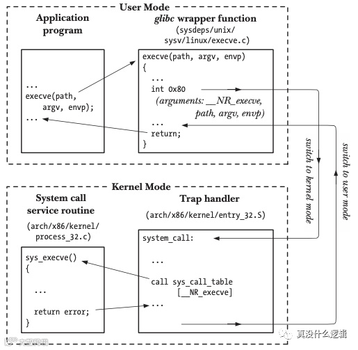 函数执行 INT 0x80指令,处理器会从用户态切换到内核态并执行预先定义好的处理器; -