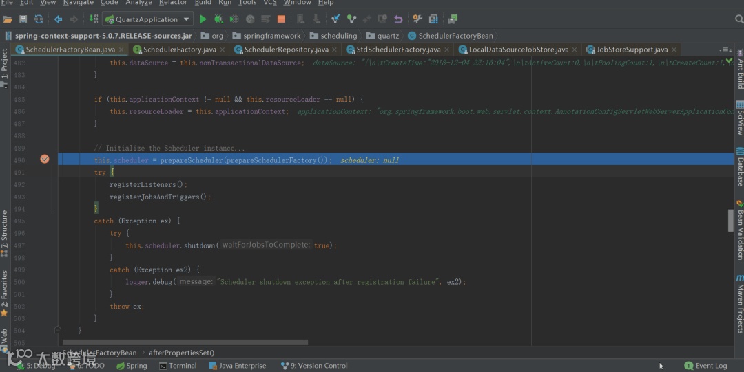 将 quartz 的配置属性设置给 SchedulerFactoryBean;将数据源设置给 SchedulerFactoryBean:如果有 @QuartzDataSource 修饰的数据源,则将 @QuartzDataSource 修饰的数据源设置 SchedulerFactoryBean,否则将应用的数据源 (druid 数据源)设置给 SchedulerFactoryBean,显然我们的应用中没有 @QuartzDataSource 修饰的数据源,那么 SchedulerFactoryBean 中的数据源就是应用的数据源;将事务管理器设置给 SchedulerFactoryBean。SchedulerFactoryBean,负责创建和配置 quartz Scheduler,并将其注册到 spring 容器中。SchedulerFactoryBean 实现 InitializingBean 的 afterPropertiesSet 方法,里面有可以设置数据源的过程
