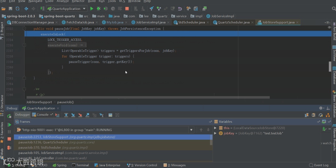 我们通过停止定时任务来跟下quartz对数据库的操作