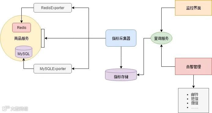 微服务架构中组件繁多,各个组件所需要监控的指标不同。比如Redis缓存一般监控占用内存值、网络流量,数据库监控连接数、磁盘空间,业务服务监控并发数、响应延迟、错误率等。因此如果做一个大而全的监控系统来监控各个组件是不大现实的,而且扩展性会很差。一般的做法是让各个组件提供报告自己当前状态的接口(metrics接口),这个接口输出的数据格式应该是一致的。然后部署一个指标采集器组件,定时从这些接口获取并保持组件状态,同时提供查询服务。最后还需要一个UI,从指标采集器查询各项指标,绘制监控界面或者根据阈值发出告警。