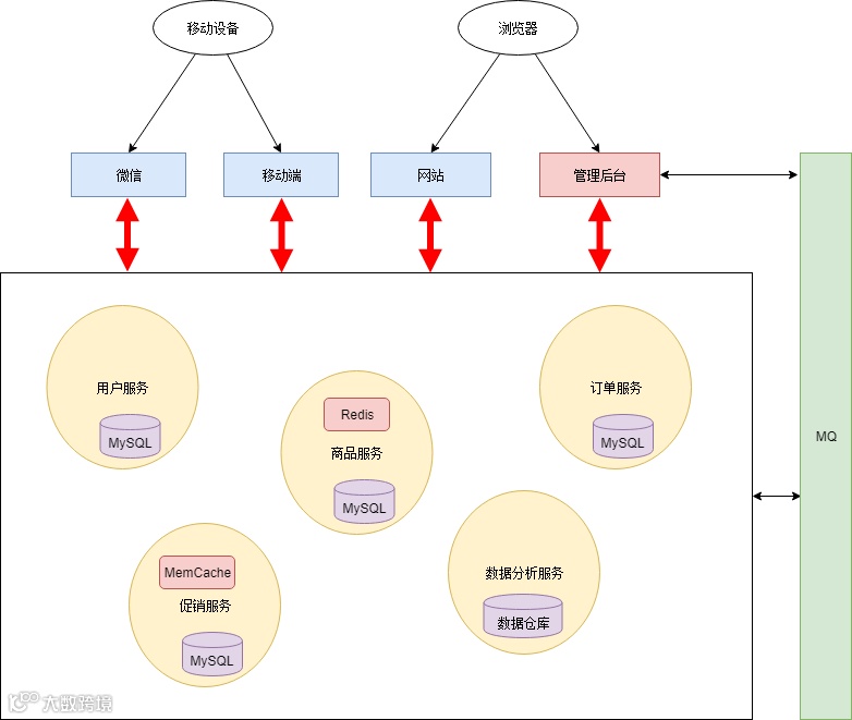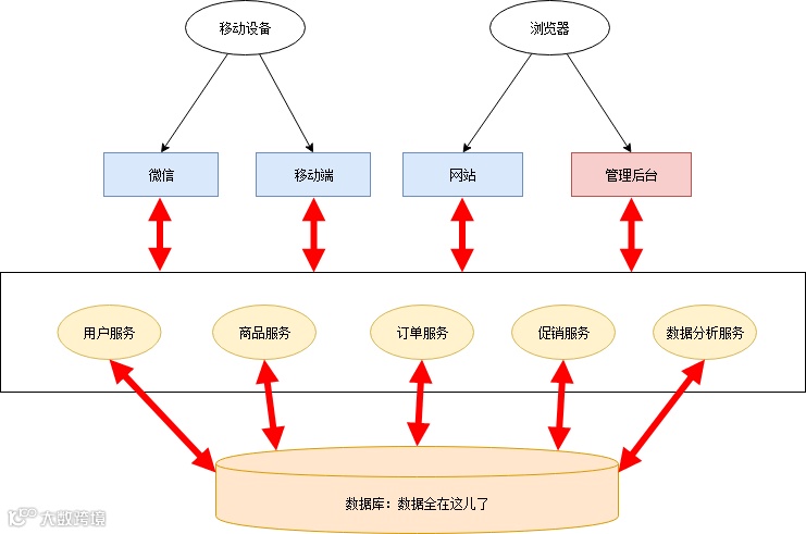 所有应用都在一个数据库上操作,数据库出现性能瓶颈。特别是数据分析跑起来的时候,数据库性能急剧下降。 -