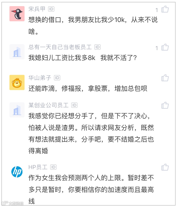 发帖人表示:“女朋友也是职业奋斗女性,感觉自己hold不住她,但是她的薪水也减轻了我很多负担,如果换了一个工资比她还低的女朋友生活质量更差。而且,另一半收入越高生活质量越高,这在数学上无法证伪。”