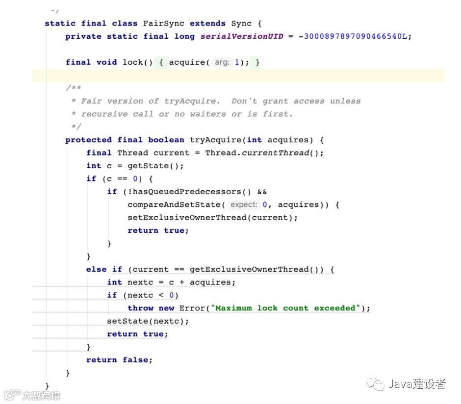 由继承图可以看到,两个类的继承关系都是相同的,我们从源码发现,公平锁和非公平锁的实现就是下面这段代码的区别(下一篇文章我们会从原理角度分析一下公平锁和非公平锁的实现)