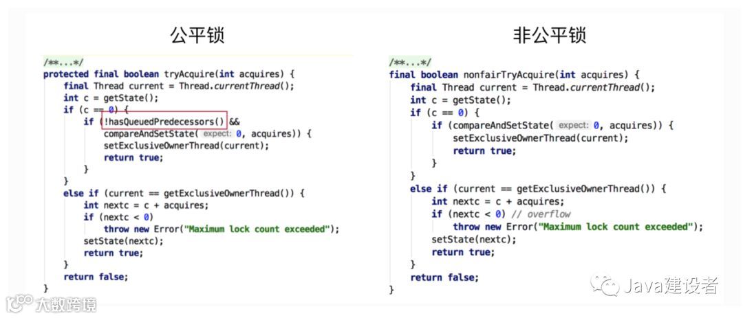 通过上图中的源代码对比,我们可以明显的看出公平锁与非公平锁的lock()方法唯一的区别就在于公平锁在获取同步状态时多了一个限制条件:hasQueuedPredecessors()。