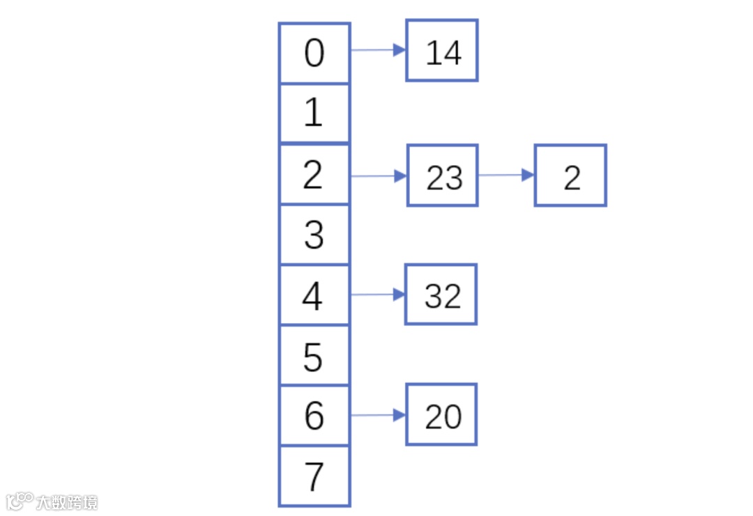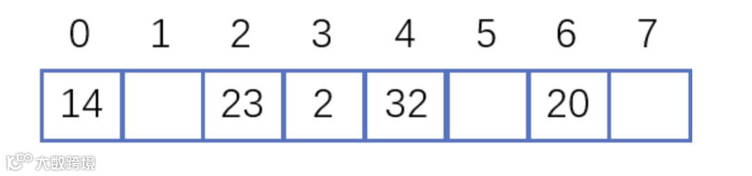 假设散列长为8,散列函数H(K)=K mod 7,给定的关键字序列为{32,14,23,2, 20}