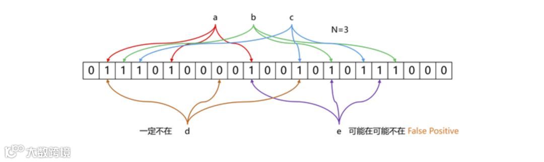 上图所示的例子中,数据a、b、c经过三次hash映射后,对应的bit位都是1,表示这三个数据已经存在了。而d这份数据经过映射后有一个结果是0,则表明d这个数据一定没有出现过。布隆过滤器存在假阳率(判定存在的元素可能不存在)的问题,但是没有假阴率(判断不存在的原因可能存在)的问题。即对于数据e,三次映射的结果都是1,但是这份数据也可能没有出现过。