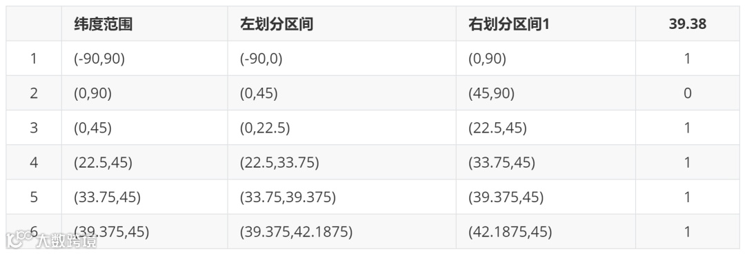 地球纬度区间是[-90,90],对于这个区间进行二分划分左区间[-90,0), 右区间[0,90]。39.3817属于右区间,标记为1