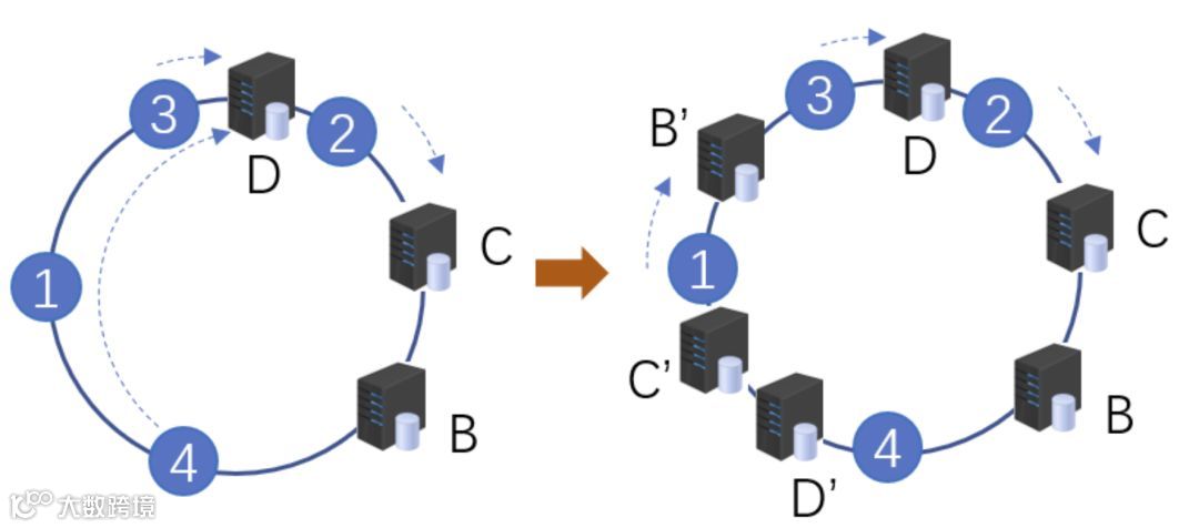 同样的,我们进行了服务器扩容以后,新增了一台服务器D,位置落在用户2和3之间。按照顺时针原则,用户2依然访问的是服务器C的数据,而用户3顺时针查询后,发现最近的服务器是D,后续数据就会存储到d上面。