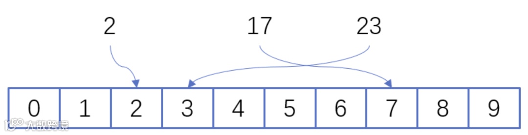 这里的两种算法的区别是2这个元素,在链表法中还是在节点2的位置上,但是在线性探测法遇到冲突时会将冲突数据放到下一个空的位置下面。