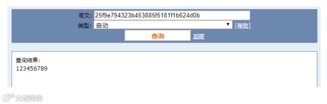 看到这里有些同学会觉得那么我们是不是对用户输入的密码进行一次MD5加密就可以了呢,这样就算恶意用户知道了hash值,也没有办法拿到用户的真实密码。假设用户的密码是123456789,经过一次md5以后得到的值是: