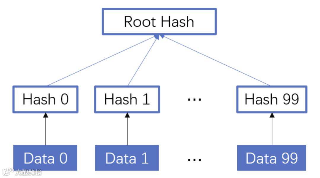 使用过bt的同学都有经验,在p2p网络中会把一个大文件拆分成很多小的数据各自传输。这样的好处是如果某个小的数据块在传输过程中损坏了,只要重新下载这个块就好。为了确保每一个小的数据块都是发布者自己传输的,我们可以对每一个小的数据块都进行一个hash的计算,维护一个hash List,在收到所有数据以后,我们对于这个hash List里的每一块进行遍历比对。这里有一个优化点是如果文件分块特别多的时候,如果遍历对比就会效率比较低。可以把所有分块的hash值组合成一个大的字符串,对于这个字符串再做一次Hash运算,得到最终的hash(Root hash)。在实际的校验中,我们只需要拿到了正确的Root hash,即可校验Hash List,也就可以校验每一个数据块了。