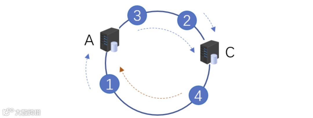 初始情况如下:用户1的数据在服务器A里,用户2、3的数据存在服务器C里,用户4的数据存储在服务器B里