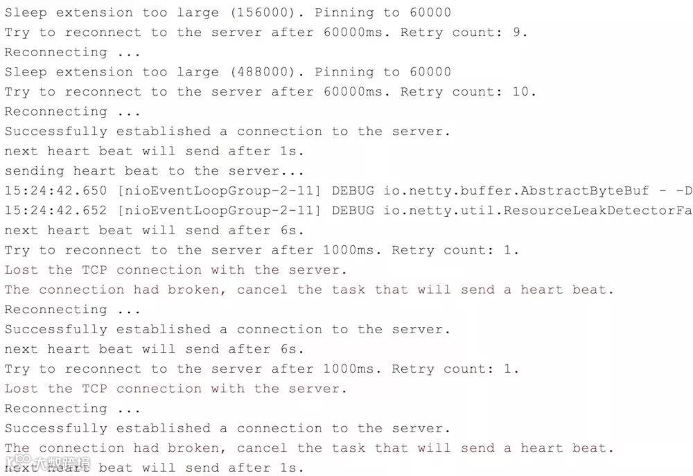 可以看到,当客户端发现无法连接到服务器端,所以一直尝试重连。随着重试次数增加,重试时间间隔越大,但又不想无限增大下去,所以需要定一个阈值,比如60s。如上图所示,当下一次重试时间超过60s时,会打印Sleep extension too large(*). Pinning to 60000,单位为ms。出现这句话的意思是,计算出来的时间超过阈值(60s),所以把真正睡眠的时间重置为阈值(60s)。