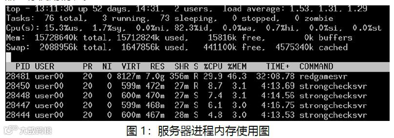 《天天爱消除》外网机器负载表现为内存占用率较高,CPU 使用率较低,同时因为是弱交互的手游,网卡流量并不会存在瓶颈。玩家同时在线高峰期,机器内存使用出现告警。核心进程组gamesvr 和checksvr 占用内存过多,下图1 是机器内存使用情况。