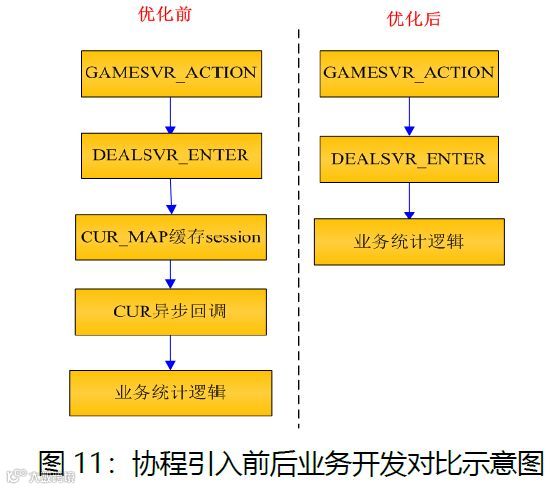 引入协程后,这类服务代码开发和维护就像写同步代码一样,结束了异步代码满天飞的局面。图11 是优化前后两种模式下完成一个需求的开发对比图。该需求就是简单统计下,玩家在登录和非登录阶段去数平拉取钻石成功和失败量。