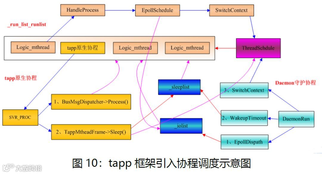 为解决上述问题,我们在这类服务中引入协程库。对代码进行改造,我们选用公司内部开源协程库libmt。图10 是在tapp 框架中引入协程之后的调度机制示