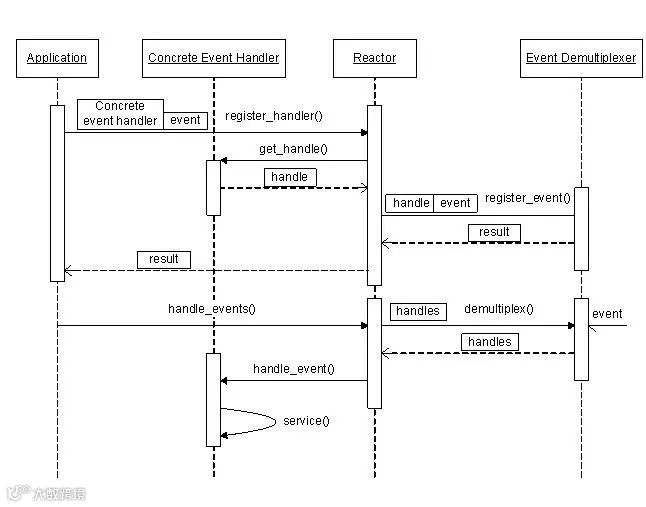 当有事件到达时,event demultiplexer会发出通知“在已经注册的句柄集中,一个或多个句柄的事件已经就绪”;