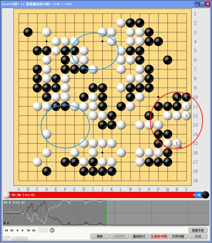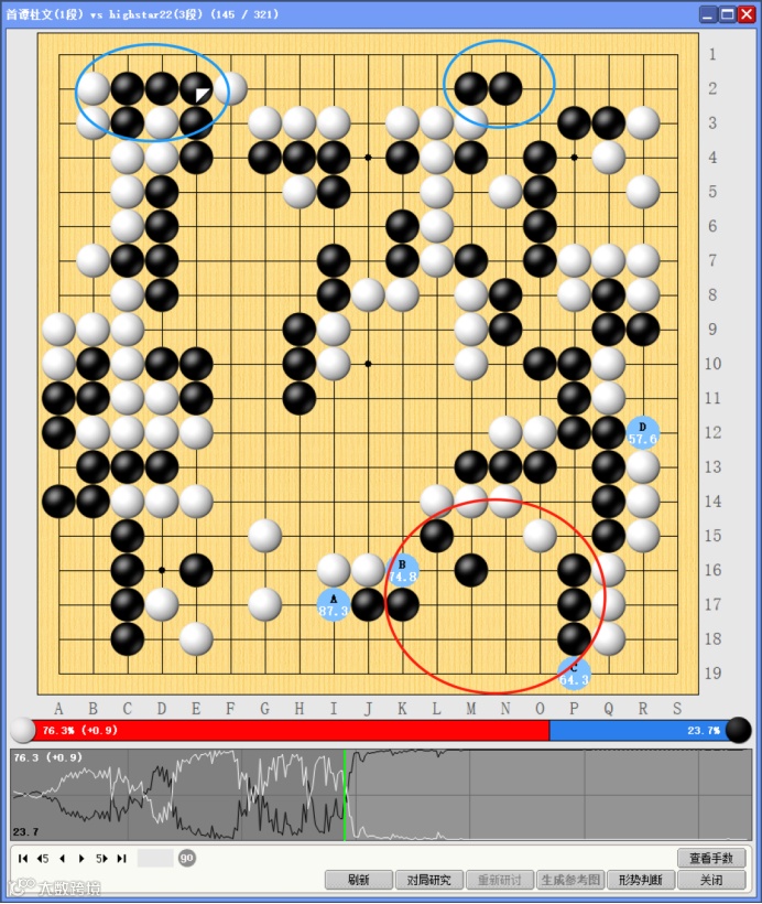 黑棋抢占了两处蓝圈的重要官子,不断缩小差距,双方决胜的战场来到红圈处——可惜白棋错失了延续领先的机会。