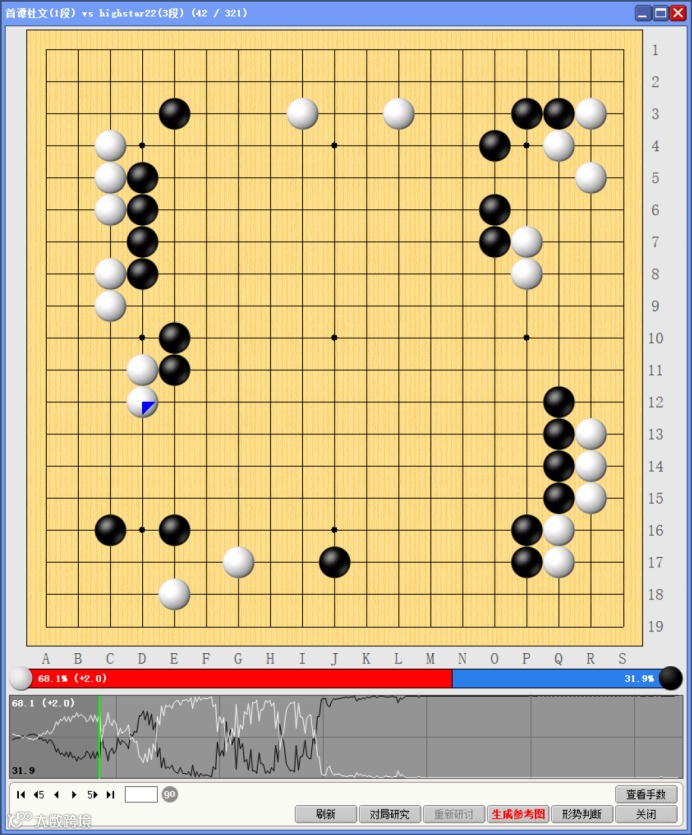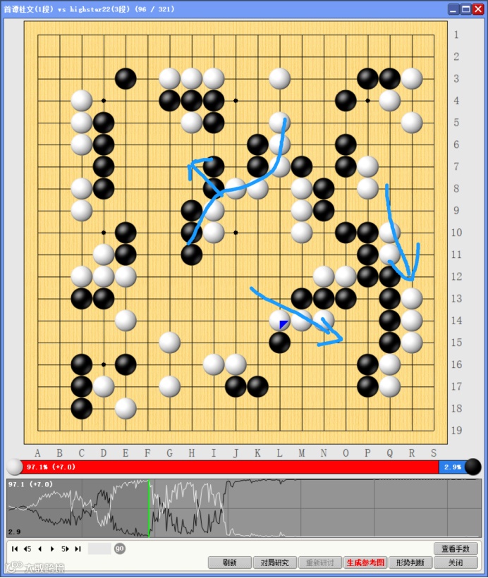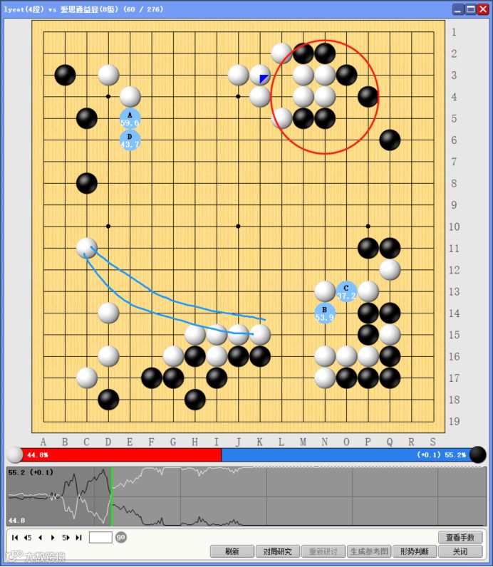 黑棋在红圈处入侵后,巧妙棋子,强化了角部领地,但忽视了白棋蓝线处的强大外势,此时AI建议黑棋应该为消除白棋外势而做出相应动作——在左上方出头,或者威胁白棋右下方弱子。