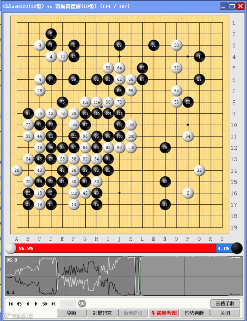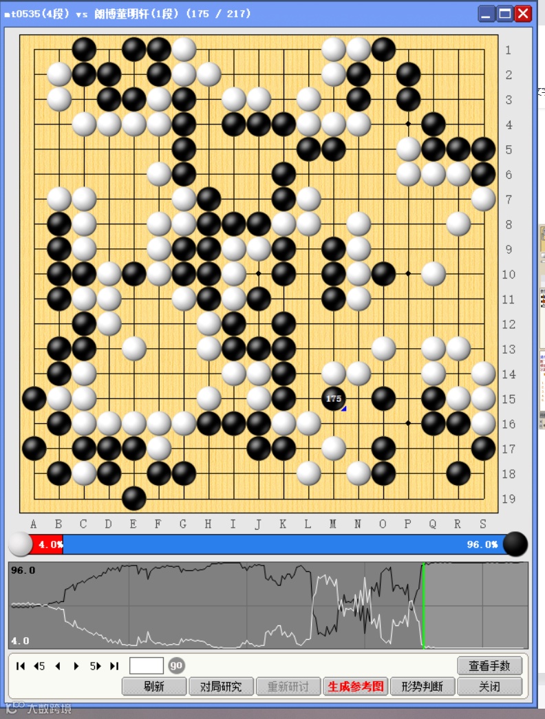 在中盘的战斗中黑127下出缓招,被白128抓住,局势又回到起跑线上,局面胶着,黑175是胜招,白无法两全,局面不可收拾,黑中盘胜!