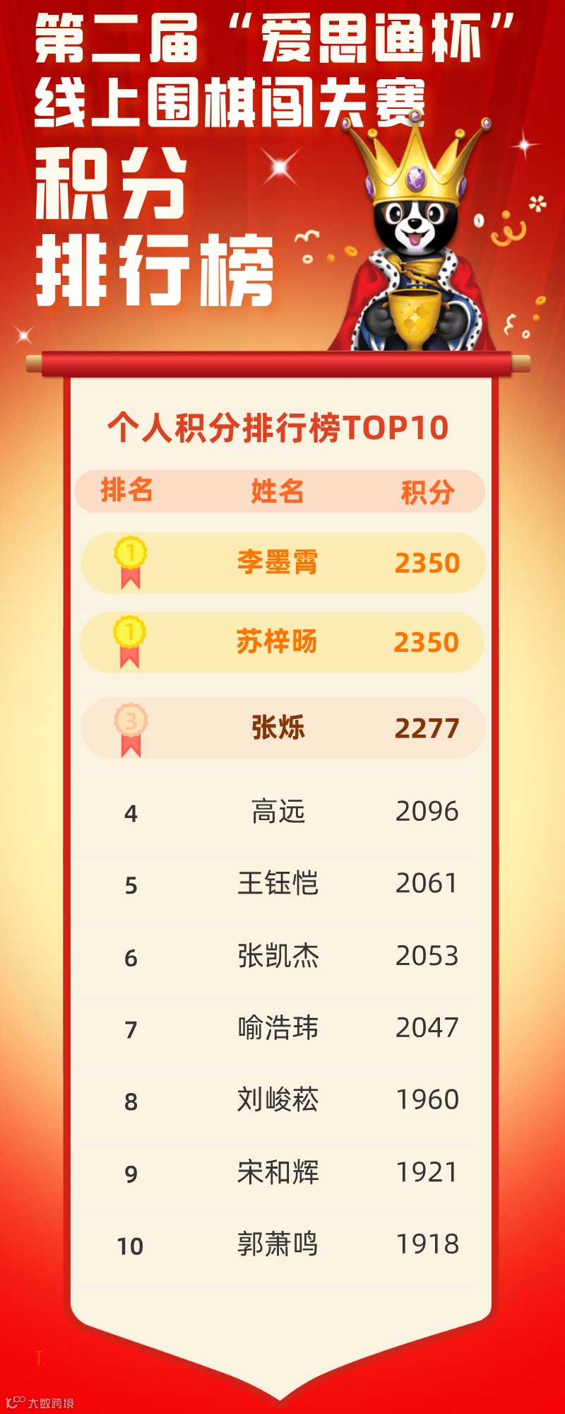 8月21日24点整,第二届全国爱宝线上围棋闯关大赛的所有参赛账号被锁定。经组委会对参赛选手的比赛积分进行统计和审核,最终评选出个人积分前十名和团体积分前三名。