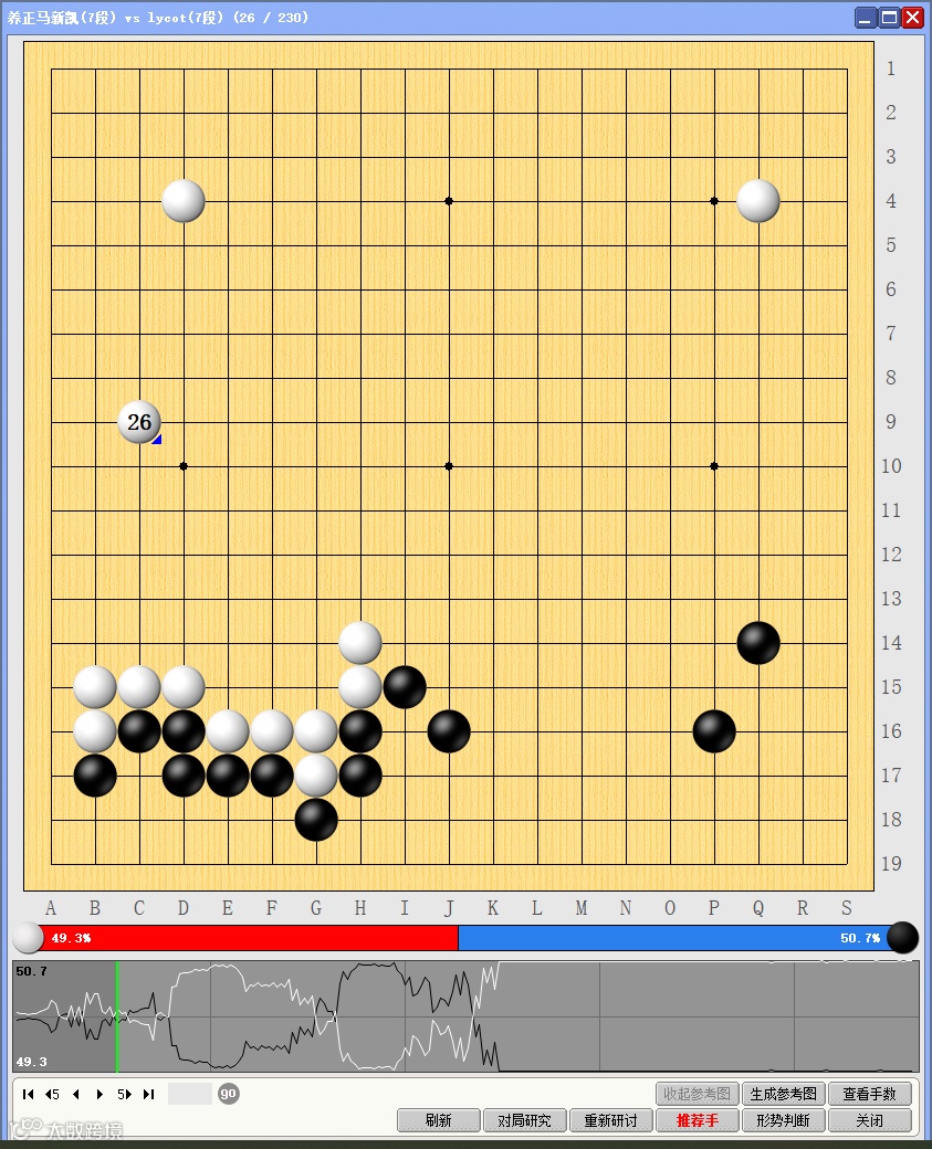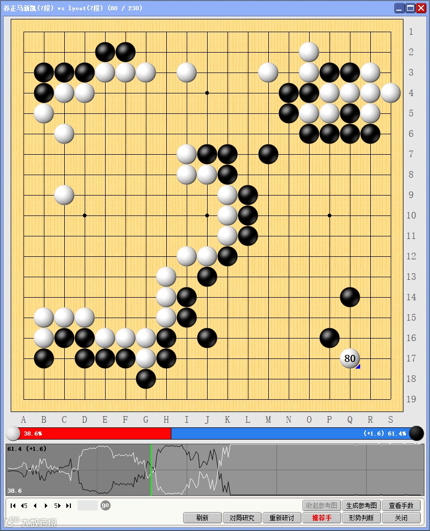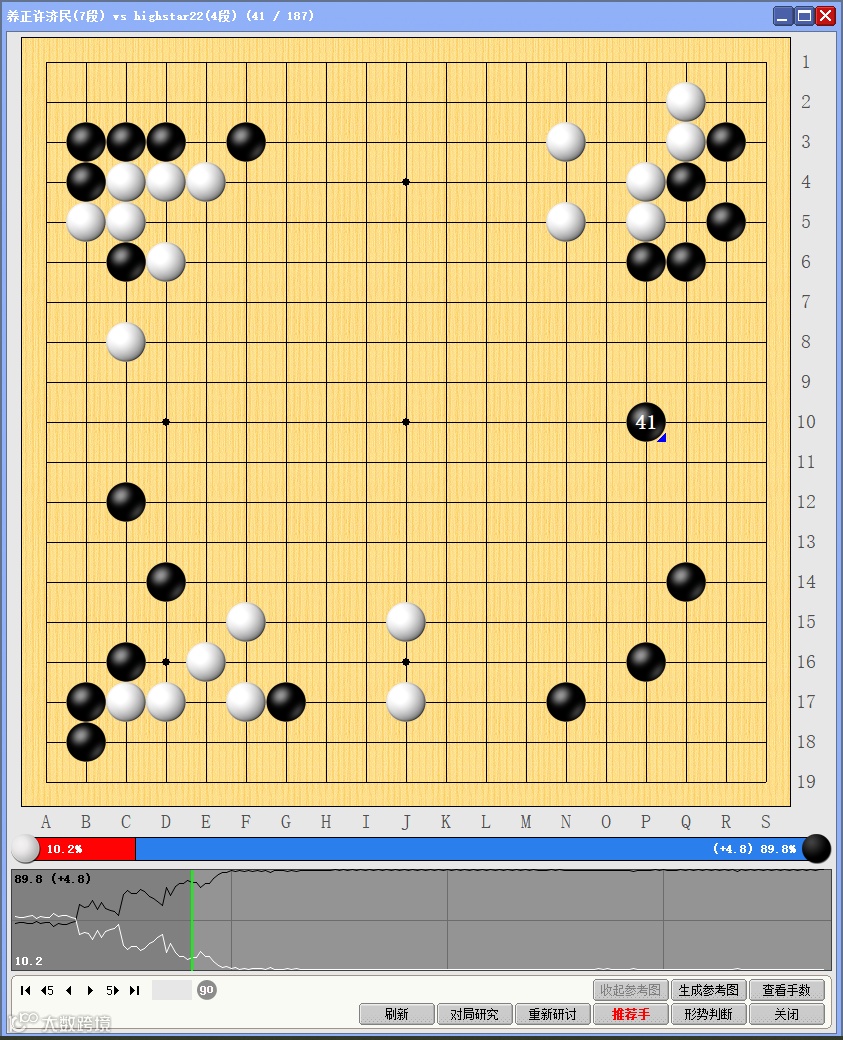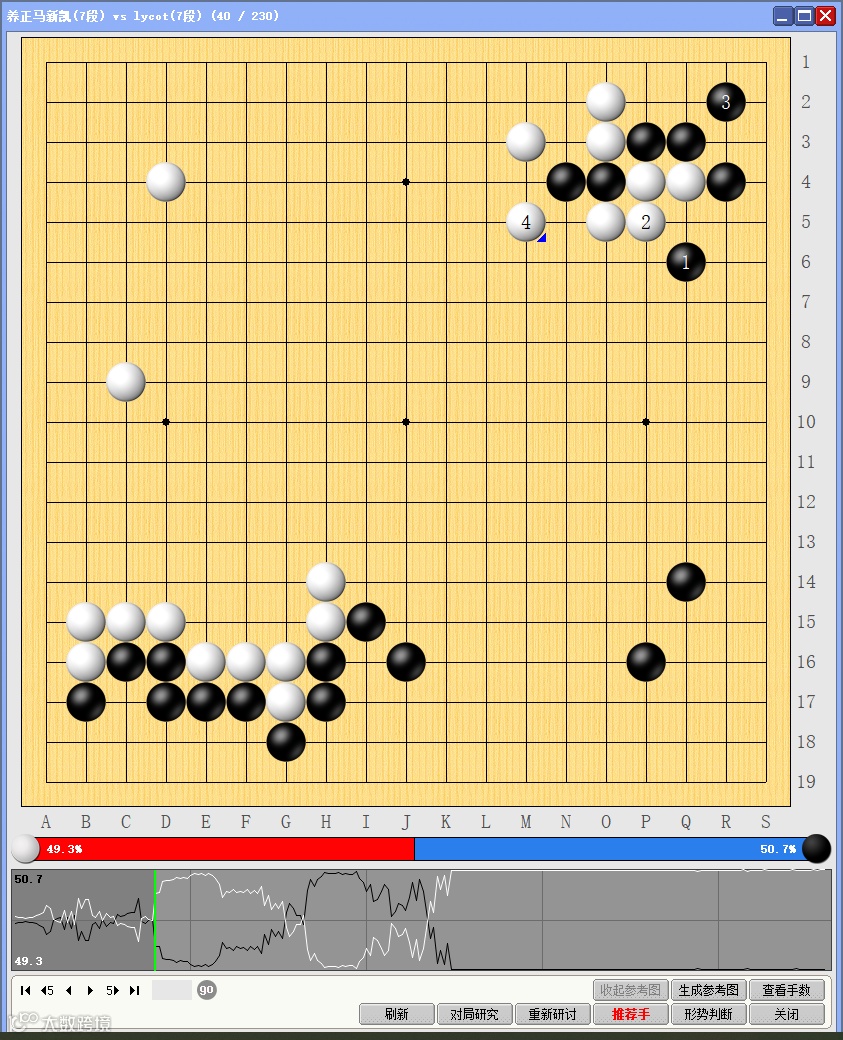 黑41拆边,布局阶段白棋行棋较缓,虽然并未出现明显的恶手,但胜率图显示黑棋的胜率越来越高。