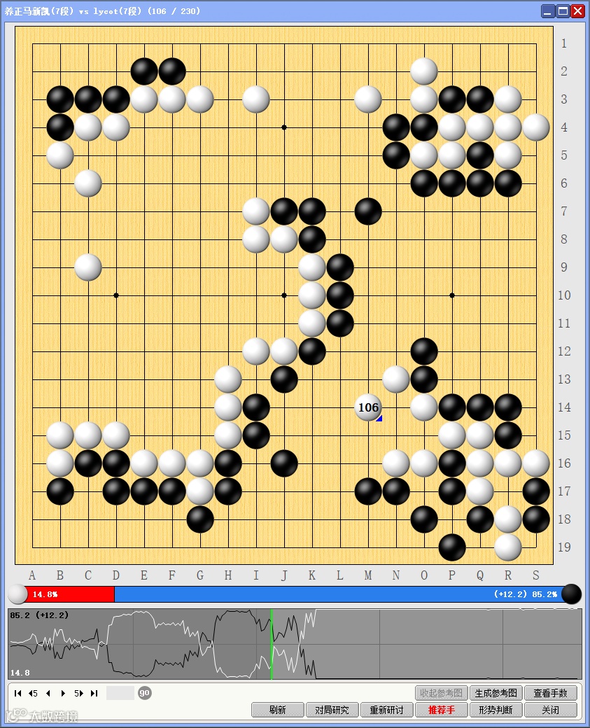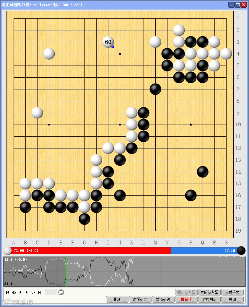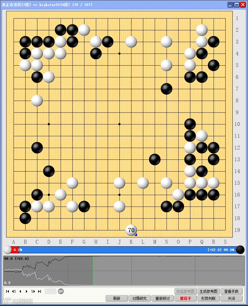白70,滑标了,使得局面本就不占优的白棋形势更是雪上加霜。这一步滑标不禁让人想起了申真谞对柯洁那盘棋经典的“神之一滑”,十分遗憾。