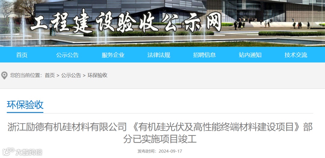 近日,工程建设验收公示网发布了浙江励德有机硅材料有限公司《有机硅光伏及高性能终端材料建设项目》已实施项目阶段验收监测报告、验收意见的公示。