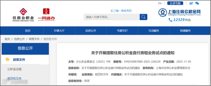 11月5日,上海市住房公积金管理委员会发布《关于开展提取住房公积金直付房租业务试点的通知》,更好服务住房公积金缴存人租房安居。通知自2025年11月20日起施行,有效期五年。
